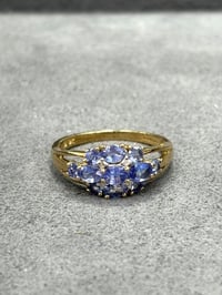9ct Yellow Gold ring - tanzanite and diamond cluster - 4 brilliant cut small diamonds - 11 Oval and Round cut Tanzanites - weight: 2.4g - size: O - claw set surrounding each stone - band opens on the shoulder each side for a fun design!