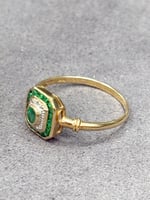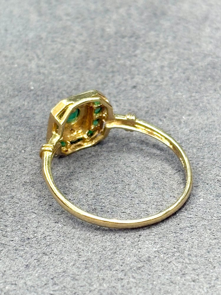 9ct Yellow Gold ring - Emerald and Diamond Precious Stones - 18 emeralds and two diamonds - main Emerald stone is an Oval cut - weight: 2.2g - size: V - beautiful piece with clear hallmarks within shank - lovely as a statement piece ring